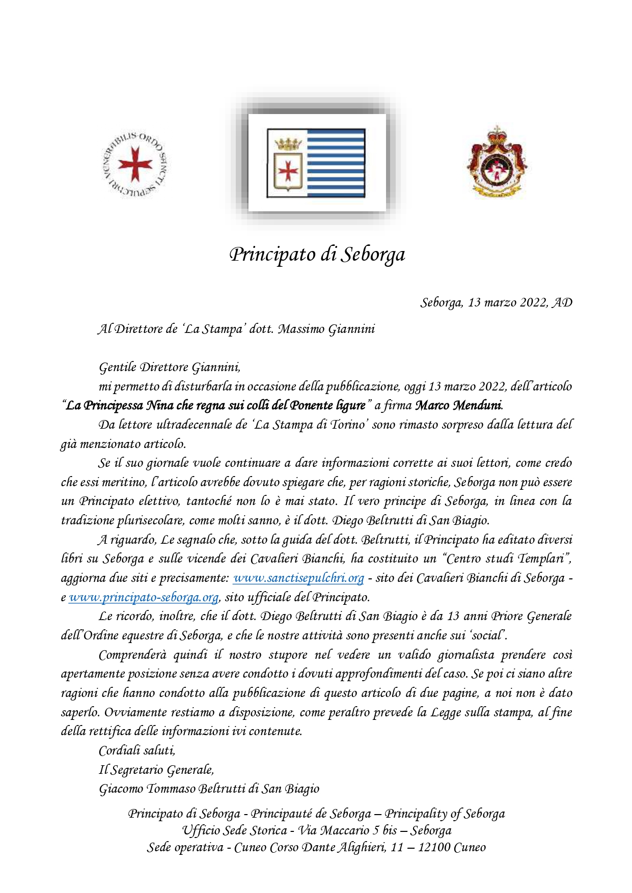 Principato di SeborgaSeborga, 13 marzo 2022, ADAl Direttore de ‘La Stampa’ dott. Massimo Giannini Gentile Direttore Giannini,mi permetto di disturbarla in occasione della pubblicazione, oggi 13 marzo 2022, dell’articolo“La Principessa Nina [...]
