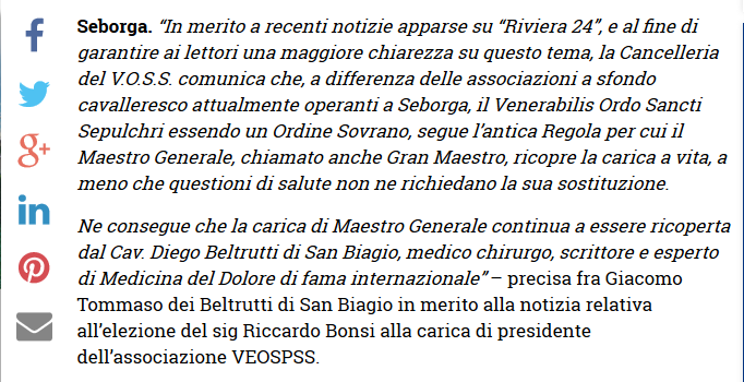 Su alcuni quotidiani online sono apparse nei giorni passati notizie relative ai risultati delle elezioni della associazione denominata V.E.O.S.P.S.S. e operante a Seborga da alcuni anni.