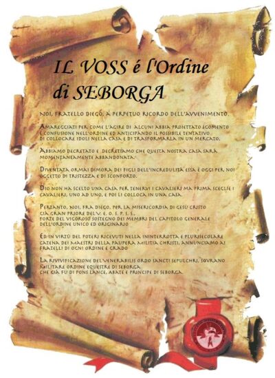 In questa data, a causa di tentativi, peraltro maldestri, portati avanti da fratelli decisi a tradire innanzitutto lo spirito della Cavalleria, lo scrivente Cav. Diego Beltrutti di San Biagio, allora Maestro del V.E.O.S.P.S.S., ne sospendeva le attività e ne azzerava tutte le cariche.